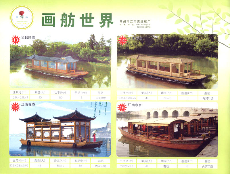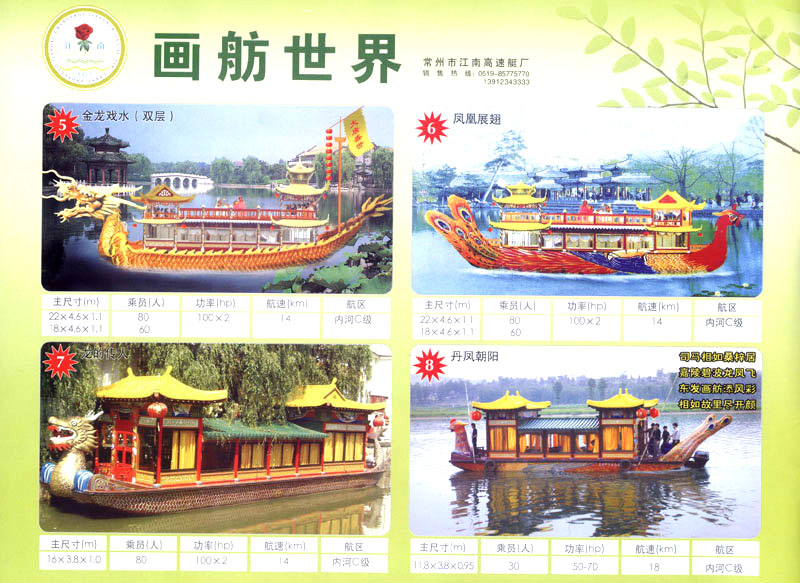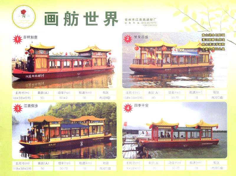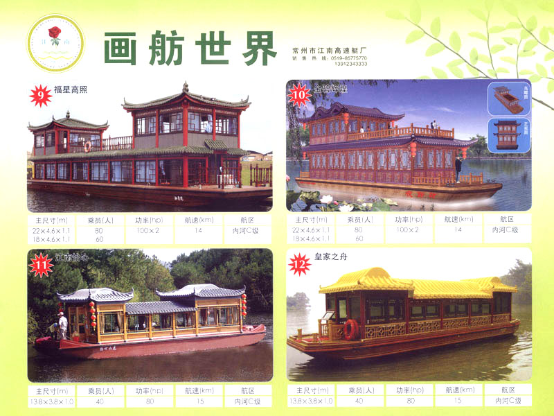 隨著人民生活的提高和水上旅游業(yè)的不斷發(fā)展,原有的游艇已遠(yuǎn)不能滿足人民群眾不斷提高的需求。為適應(yīng)水上旅游業(yè)市場(chǎng)的變 化,我廠開發(fā)研制了符合中國國情、具有民族特色的仿古畫舫游艇及國際最新流行款式一城市旅游休閑觀光艇。特別近兩年又開發(fā)了一批精品畫舫船投放市場(chǎng)之后深受景區(qū)的歡迎。今年我廠又開發(fā)了適用少數(shù)民族的“風(fēng)雨橋”、“寨門”畫舫艇。在湖南、廣西、云南、貴州深受愛戴。此艇別具風(fēng)格,民族風(fēng)情特別濃厚。侗鄉(xiāng)一號(hào)計(jì)劃在2006年5月1日投放在貴州黎平侗鄉(xiāng)風(fēng)景區(qū)八舟河景區(qū)使有(風(fēng)序號(hào))。我廠歡迎用戶來圖加工,來廠考察訂貨,畫舫艇款式多多,終有一款適合你。歡迎來電來函垂詢。索樣即寄。誠心銷售、人情化服務(wù)、企業(yè)文化、精品畫舫。