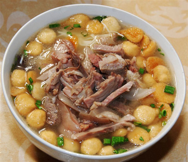 牟利英走進(jìn)廚房給客人盛羊湯,只見她在漏勺里放入百葉絲和豆炙餅,入鍋燙熟,倒入一只大碗,再倒入一碟羊雜碎,然后舀起一勺篤得奶白的羊骨頭湯,手腕一翻倒入碗里,熱騰騰、香噴噴的一碗羊湯就做好了,此時(shí)別忘了往湯里扔一小撮碧綠生青的蒜葉提香。趁熱喝,從嘴里一直熱到胃里,就連整個(gè)人似乎也跟著暖熱了起來。談旭東在一邊說,他小時(shí)候,羊肉館里用的豆炙餅還是自家熯的(熯,音同“漢”,意為焙或用極少的油煎),現(xiàn)在雖說是別人供貨的,但也算是特制的,要關(guān)照多熯一會(huì)兒,這樣才不會(huì)一下鍋就篤爛,拿回家后,他還要再用油爆香,放在湯里才更好吃。