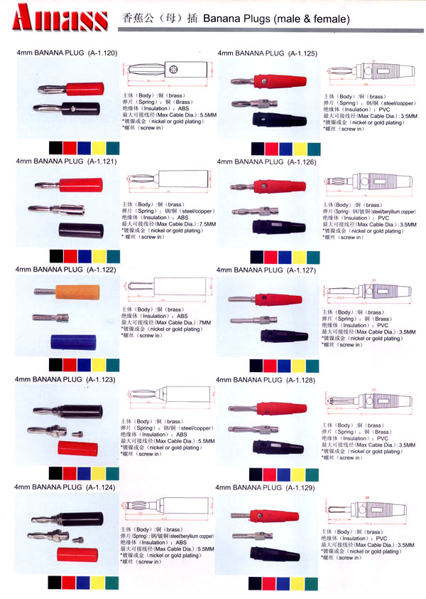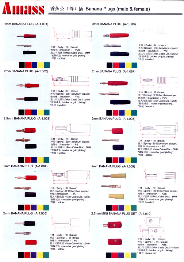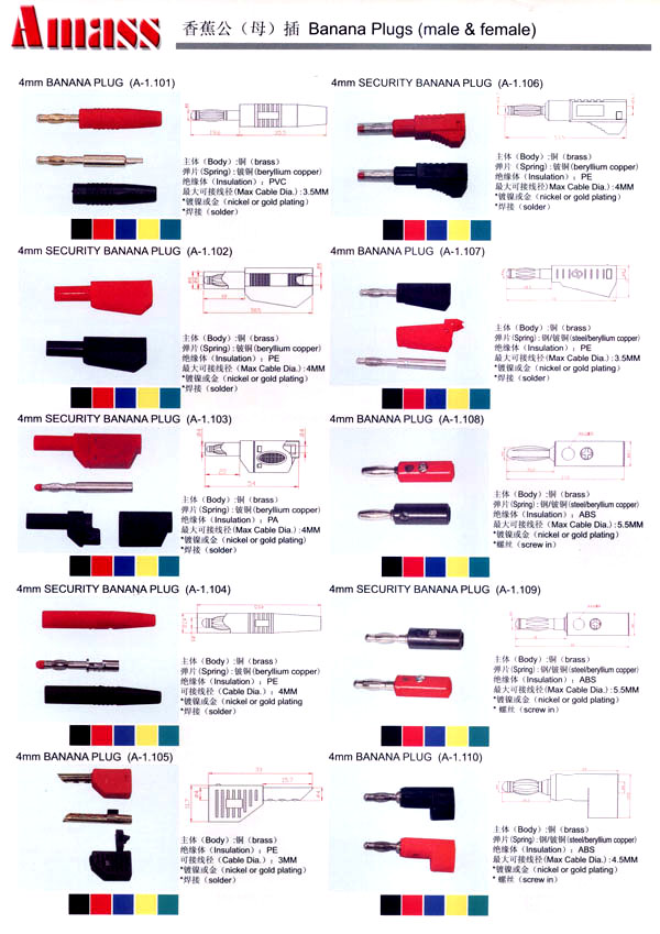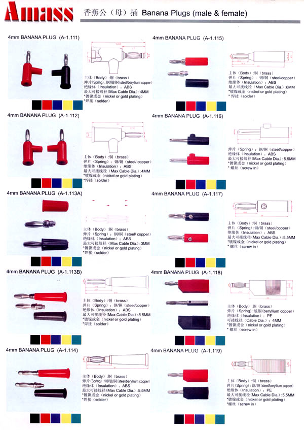 本公司專業(yè)生產(chǎn)各類香蕉插頭,香蕉插座,接線柱,電瓶夾,鱷魚夾,測試導(dǎo)線,測試筆等。產(chǎn)品分2mm/2.5mm/3mm/3.5mm/4mm五大系列,百余種款式, 各種香蕉插廣泛用于儀器、儀表、電力測試、教學(xué)、玩具,視聽設(shè)備、醫(yī)療儀器,保健產(chǎn)品等領(lǐng)域。公司技術(shù)力量雄厚,生產(chǎn)工藝先進,產(chǎn)品遠銷港、臺、歐美,并與飛利浦等國際品牌配套。公司本著精益求精的理念,歡迎新老客戶光臨。