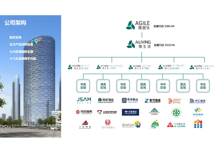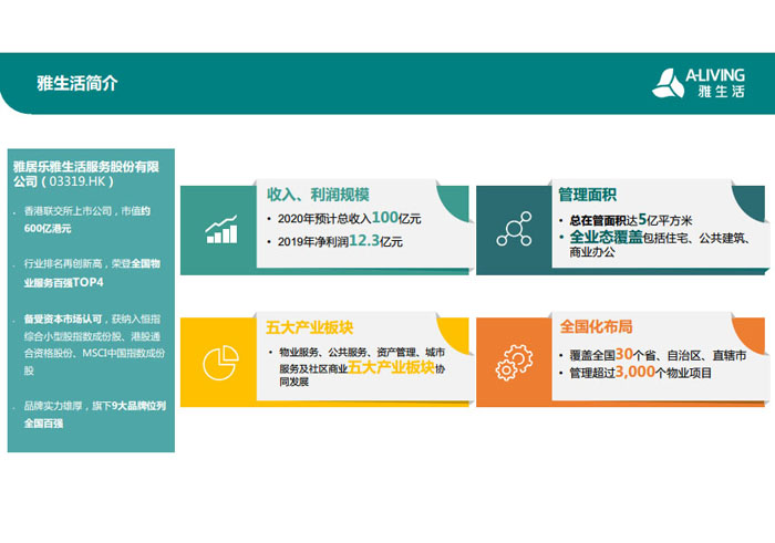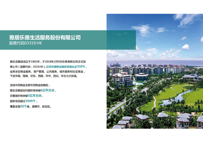 “人是雅居樂關注的核心,雅居樂不僅要蓋好房子,更希望全方位呵護業(yè)主的一生! 2015年,雅居樂集團重新定義社區(qū)服務理念,以聯(lián)動發(fā)展模式,整合最優(yōu)質(zhì)的社區(qū)資源,為業(yè)主提供全面的居家生活解決方案。因此,雅居樂集團“1+N”多元發(fā)展戰(zhàn)略規(guī)劃下的首個產(chǎn)業(yè)集團——雅生活集團應運而生。目前雅生活集團已集結物業(yè)、科技、旅游、廣告、營銷、驗房六大業(yè)務艦隊。2018年2月9日,雅生活集團正式在香港聯(lián)合交易所主板掛牌上市(股票代碼03319.HK),成為中國首家紅籌分拆H股的物業(yè)服務企業(yè)。