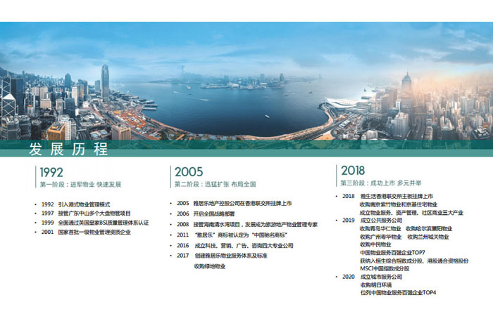 一、立足北上廣,面向全中國,走向全世界 1992年,雅居樂物業(yè)開篇中山,率先引入港式物業(yè)管理模式。1997年,依托雅居樂地產(chǎn)的崛起,連續(xù)接管中山多個項目,成為高端大盤物業(yè)管理的領跑者。1999年,雅居樂物業(yè)開啟專業(yè)化發(fā)展模式,全面通過英國皇家BSI的ISO9000質(zhì)量管理體系認證,2001年成為國家首批一級物業(yè)管理資質(zhì)企業(yè)。 2002年,隨著廣州雅居樂花園的盛大啟幕,雅居樂物業(yè)邁開向廣州進軍的步伐。為尋求更長遠的發(fā)展,雅居樂積極構思上市藍圖,2005年在香港成功上市。在深耕珠三角城市群的同時,2006年雅居樂物業(yè)揮師北上,正式開啟全國部署戰(zhàn)略。2008年,接管海南清水灣項目,揭開旅游地產(chǎn)物業(yè)管理的新篇章。 接下來近十年里,雅居樂物業(yè)始終保持著最年輕的成長姿態(tài),依托“管理數(shù)字化、服務專業(yè)化、流程標準化和操作機械化”的發(fā)展戰(zhàn)略,雅居樂物業(yè)榮膺2018中國物業(yè)服務百強企業(yè)第11名,2018年中國物業(yè)服務百強企業(yè)成長性第二名、2018年中國物業(yè)服務百強服務質(zhì)量領先企業(yè)、2018年中國物業(yè)服務百強滿意度領先企業(yè)、2018中國物業(yè)服務百強經(jīng)營績效領先企業(yè)、旅游地產(chǎn)物業(yè)管理領先品牌、2018年中國辦公物業(yè)管理優(yōu)秀企業(yè)(綠地物業(yè))、2017中國物業(yè)管理企業(yè)品牌價值第12名、2017中國物業(yè)管理企業(yè)綜合實力第12名、中國藍籌物業(yè)企業(yè)、《旅游地產(chǎn)物業(yè)管理服務標準》(團體標準)起草工作等多項殊榮。 目前,雅生活集團已形成廣州、中山、深圳、南京、上海、西安、成都、海南、云南、北京、鄭州、南寧、沈陽、武漢、馬來西亞十五大城市公司全面發(fā)展的蓬勃態(tài)勢。截止2017年12月31日,雅生活集團管理范圍覆蓋全國逾69座城市與地區(qū),服務類型涵蓋主流住宅、高端豪宅、旅游地產(chǎn)、商業(yè)、寫字樓等多種業(yè)態(tài),合約總建筑面積為12610萬平方米,擁有200多個項目,服務業(yè)主逾100萬人。 2017年6月,雅生活集團收購綠地物業(yè)100%股權,并與綠地集團簽署戰(zhàn)略合作協(xié)議,8月,綠地集團投資10億元獲得雅生活集團20%股權。未來,雅生活集團將實施“雅居樂物業(yè)”與“綠地物業(yè)”雙品牌驅動戰(zhàn)略,還將尋求在A股上市,力爭打造中國物業(yè)“A+H”第一股。