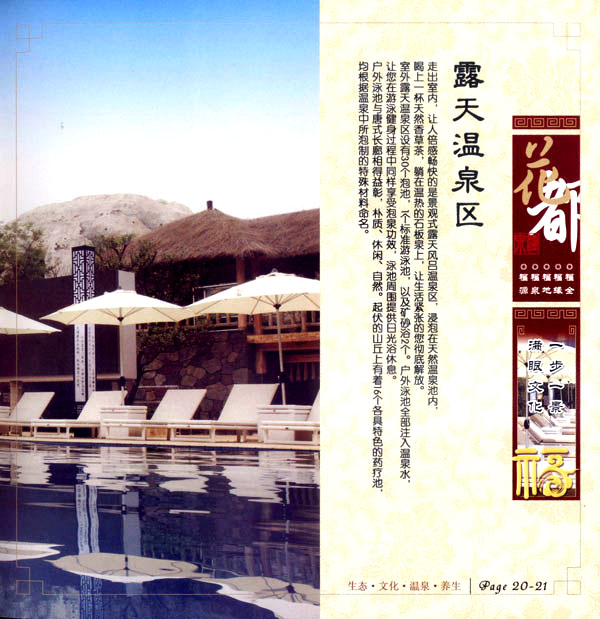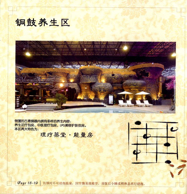 淹城花都溫泉水城孕育天地之精華,悅身、悅?cè)、悅心、悅神。置身其中泉水潺潺,霧氣繚繞、花瓣飄香,恍若仙境!稗渌略谑郑ㄏ銤M衣”,花都溫泉的浪漫與溫潤(rùn)在這里完美展現(xiàn)。 花都溫泉水城包括洗浴區(qū)、戲水世界、露天溫泉、自助餐廳、生態(tài)房、別墅區(qū)、紅文化房、VIP區(qū)等多種功能區(qū)域,是集溫泉養(yǎng)生、休閑住宿、演藝會(huì)務(wù)為—體的休閑度假勝地,給賓客帶來江南小鎮(zhèn)的浪漫水城之旅。 古木新枝畔賓客對(duì)酒當(dāng)歌,溪泉石椅旁把茶品啜。 淹城-三勤生態(tài)酒店,這里是一處綠色生態(tài)的美食家園。此地鬼斧神工.奇水異石,和風(fēng)細(xì)雨林中穿過,引百鳥朝來暮歌;這里集生態(tài)餐飲、演藝、中小型會(huì)務(wù)為一體,將現(xiàn)代裝飾風(fēng)格和古雅拙樸的自然裝修完美整合;這里聚集大江南北名廚,推出精致綠色美昧佳肴。來到這里,賓客可享田園至美之景,品舌尖至鮮之味,實(shí)乃人生一大樂事。