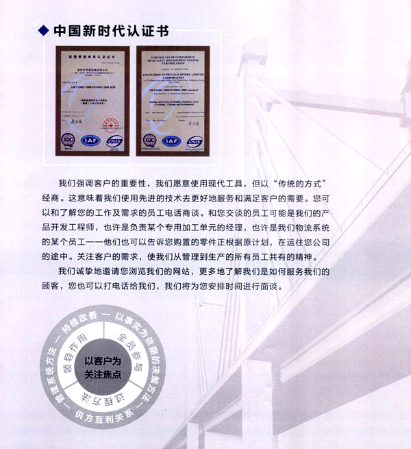 公司于2007年6月通過(guò)IS09001質(zhì)量體系認(rèn)證。本著信譽(yù)第一,誠(chéng)實(shí)合作,嚴(yán)格管理為服務(wù)宗旨,全員參與、持續(xù)改善。提升品質(zhì)、準(zhǔn)時(shí)交貨、客戶(hù)滿意的質(zhì)量方針。為客戶(hù)提供優(yōu)質(zhì)的產(chǎn)品,周到的服務(wù)。嚴(yán)格的品質(zhì),快捷的送貨,完善的生產(chǎn)設(shè)備,一流的技術(shù),使公司在同行業(yè)中占有一席之地。
