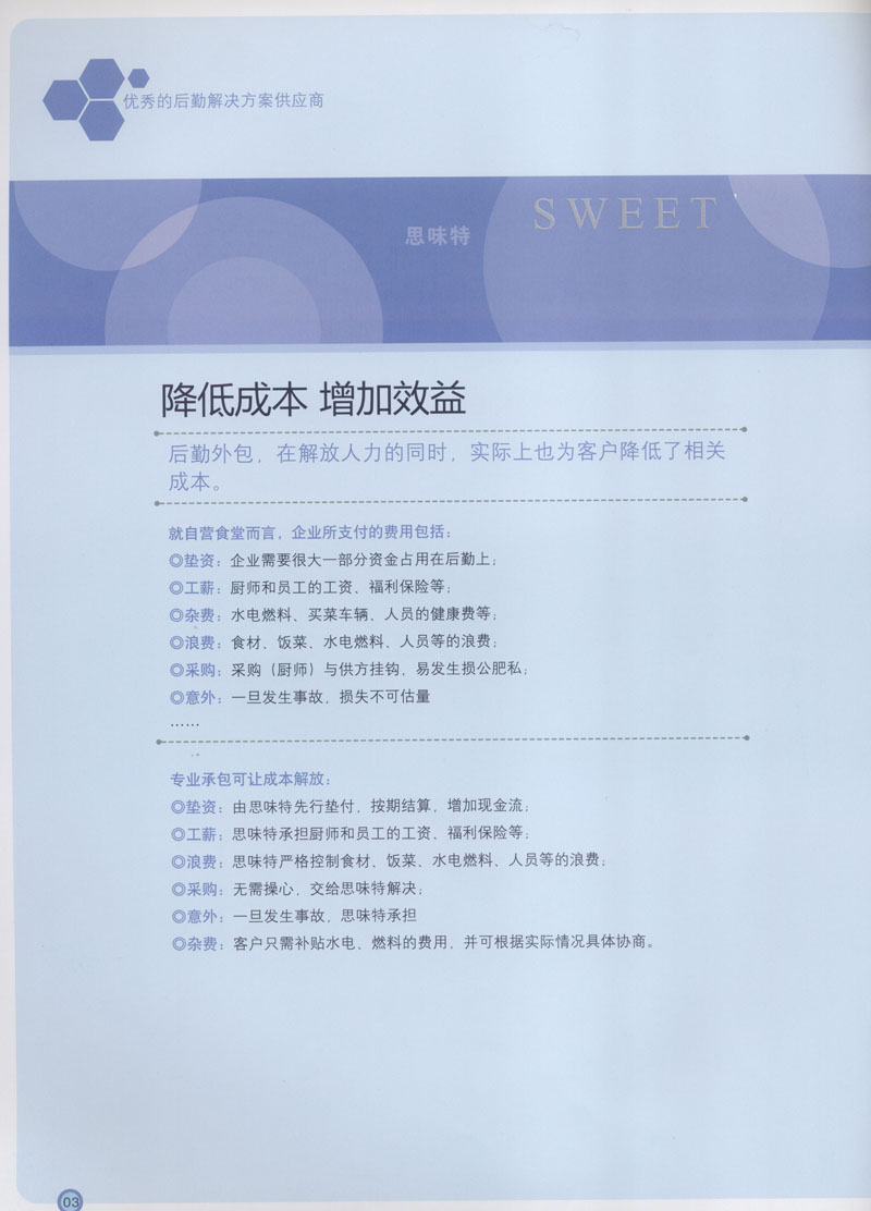 常州市思味特餐飲有限公司是一家專業(yè)從事企事業(yè)后勤服務(wù)的有限責(zé)任公司,公司從承包食堂起步,逐漸發(fā)展為經(jīng)營(yíng)團(tuán)膳承包、營(yíng)養(yǎng)送餐、生活區(qū)管理、連鎖餐廳的綜合型企業(yè)。2008年公司斥資100萬元,在常州興建了可以同時(shí)提供3000餐膳食的中央廚房,重點(diǎn)打造“和美客”后勤服務(wù)品牌,全力為企事業(yè)單位解決后勤后顧之憂。 到目前為止,我們合作成功的企事業(yè)單位超過50多家,服務(wù)人數(shù)突破15萬,合作單位包括國(guó)家機(jī)關(guān)、國(guó)有企業(yè)、三資企業(yè)、民營(yíng)企業(yè)、學(xué)校、醫(yī)院等,其中不乏國(guó)際知名品牌公司。 和美客愿為更多的國(guó)內(nèi)外企事業(yè)單位及機(jī)關(guān)團(tuán)體分憂解難,從廚房設(shè)計(jì)、菜品配送、團(tuán)膳承包、到生活區(qū)管理等提供全方位的服務(wù)。