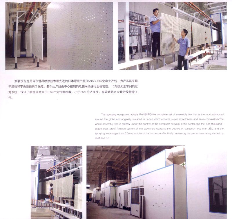 公司在成立之初即以一批具備多年經(jīng)驗(yàn)的技術(shù)骨干為中心,以雄厚的設(shè)計(jì)班底,技術(shù)過硬的操作團(tuán)隊(duì),富有管理經(jīng)驗(yàn)的專業(yè)人才為客戶提供一流品質(zhì)的產(chǎn)品和完善的服務(wù)。現(xiàn)已具備年產(chǎn)50萬平方米氟碳鋁單板、20萬平方米蜂窩板和30萬鋁制天花的生產(chǎn)能力。