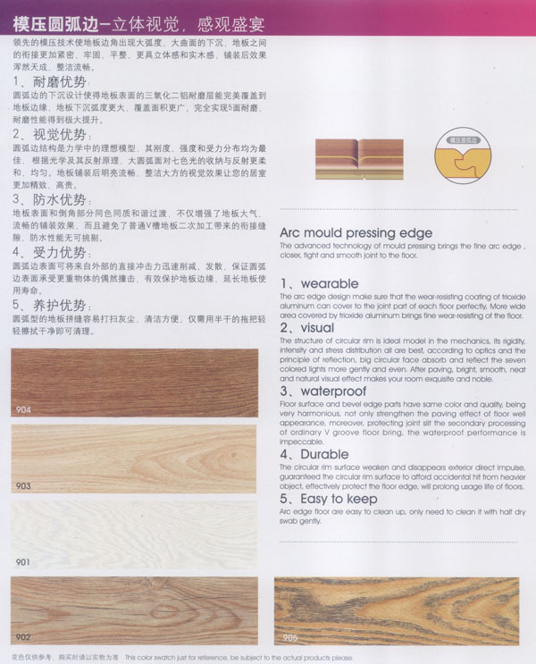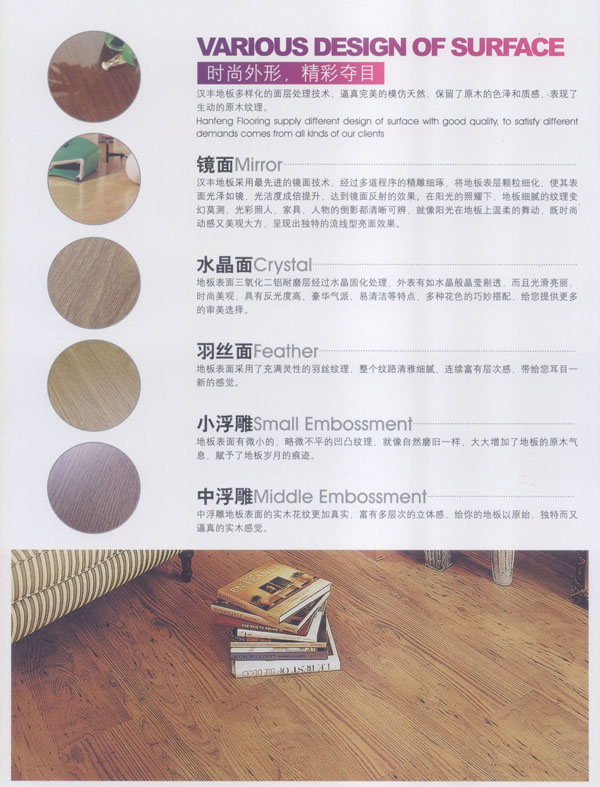 常州漢豐裝飾材料有限公司是一家涉及強化地板制造、屏風(fēng)鋁材生產(chǎn)、進出口貿(mào)易的大型公司。2001年公司投入重資.全面引進世界頂級一體化自動流水生產(chǎn)線和具有國際先進水準(zhǔn)的德國權(quán)威木地板生產(chǎn)技術(shù),興建強化地板生產(chǎn)基地。多年以來.一直不斷加強生產(chǎn)設(shè)備、廠房基礎(chǔ)投入,目前公司年生產(chǎn)強化地板能力已經(jīng)達到了500萬平方米,步入國內(nèi)一流行列,具備了雄厚的國際競爭力。 漢豐地板以奉獻生活中最完美的地板為發(fā)展目標(biāo),時尚流行的設(shè)計風(fēng)格和多樣化的產(chǎn)品類型,贏得了市場的廣泛贊譽和肯定。產(chǎn)品嚴(yán)格按照歐洲標(biāo)準(zhǔn)檢測強化木地板的各項性能指標(biāo).達到百分百的國際技術(shù)標(biāo)準(zhǔn),確保了每一塊地板都有著上乘品質(zhì),是綠色環(huán)保的好地板。并先后通過了Isc)9001國際質(zhì)量管理體系認(rèn)證,IS014001國際環(huán)境管理體系認(rèn)證.中國環(huán)境標(biāo)志產(chǎn)品認(rèn)證,深得用戶的一致好評,是寫字樓、商場、大型超市、學(xué)校、建筑樓宇、娛樂場所、家用私宅等鋪裝的首選地板。