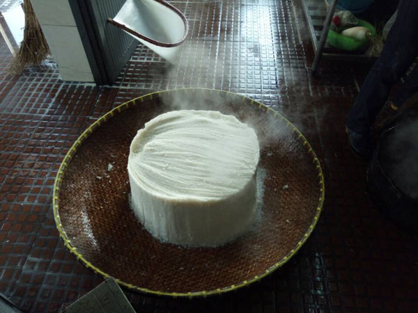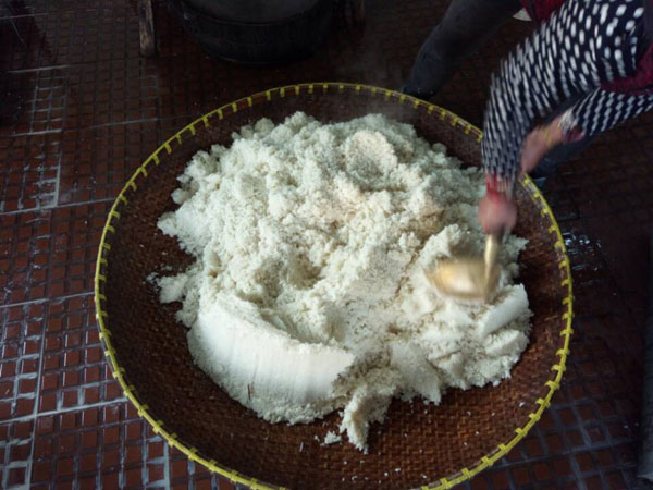 第三步:拌入酒曲,這時候才發(fā)現(xiàn)了“木桶”的神奇之處:一頭空,另一頭也是空,只不過用鋼筋做了個柵欄。之前蒸米飯,老徐是墊上了蒲草,一方面讓糯米飯更易熟,另一方面也增加了糯米飯的清香氣息。把糯米飯倒入蠶匾中,邊翻動糯米飯邊撒上酒曲,使酒曲與糯米飯充分拌勻。