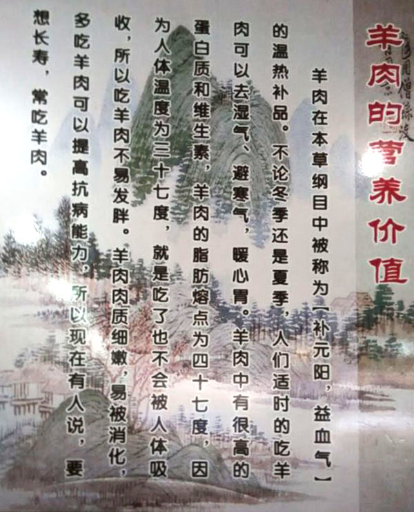 鄭陸橋頭羊肉館主要從事羊肉、羊肉制品的加工。羊肉性溫?zé)帷⒀a氣滋陽、暖中補氣、開胃健脾、還可以去濕氣避寒冷,暖胃寒、養(yǎng)吃百草、養(yǎng)根據(jù)自身生理需要選擇草木、固羊有“百藥之庫”之稱。古人云:多吃羊肉、健康長壽。